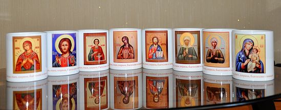 Якась творча майстерня пропонує гуртки з молитвами "Святе Джерело" (за вибором з 10 молитов: "молитва Блудного сина на тлі ...", а також молитва студента, водія, закоханих, молитва щоденна, на робочому місці і т.д.), серію кухлів "Святі лики", з молитвою на освячення води та чудотворною іконою (вибір ікон з 30 найменувань), вона також може виготовити кухоль з іконами під ваш особистий замовлення. А ще ви можете придбати "подарунковий комплект, з трьох кухлів, з іконами: Господь" Вседержитель ", БМ" Живоносне джерело "," Серафим Саровський чудотворець "(орфографія оригіналу).