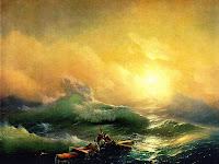 1850. Айвазовський пише свою найвідомішу картину - «Дев'ятий вал». Дикі громади хвиль готові розчавити загублену в океані крихітну групу зазнали корабельної аварії. Ми не знаємо, скільки днів провели вони у відкритому морі, але люди змучені до краю. Весь жах боротьби зі стихією вкладений в цей полотно. Але промінь сонця, який пробив грозові хмари, - промінь надії - обіцяє знесиленим і виснаженим порятунок. Ось-ось буря вщухне, і люди, що обліпили, як мурахи, уламок щогли, будуть врятовані. Нехай шаленіє океан, нехай ще грізно здіймаються гігантські хвилі. Воля, мужність, віра людини виявилися сильнішими стихії. Цю картину бачили сотні тисяч глядачів. Її слава увінчала і без того велику популярність художника Айвазовського - співака моря і рідного йому російського військового флоту.