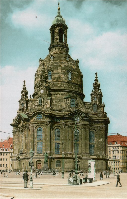 Ще одна велика церква Дрездена, євангельська Фрауенкірхе, височить за Брюлевской Терасою, на площі Ноймаркт. Ось як вона виглядала на рубежі XIX / XX століть: