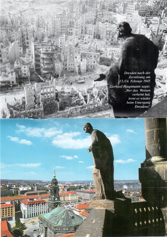 Лауреат Нобелівської премії письменник Герхарт Гауптман: «Хто розучився плакати, навчиться знову, глянувши на загибель Дрездена». Знімок зроблений з Нової ратуші (фігури на ній потрапили в кадр), попереду церква св.Хреста Kreuzkirche.