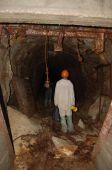 Ми вирішили не ризикувати і піднялися вгору від дороги. Минуло 10 хвилин, 20. Втративши терпіння, ми з Оком пішли на розвідку. Підійшли до руїн комплексу, який раніше оточував штольню А. Поруч були люди. Обережно визирнувши з-за рогу, вдалося розглянути, що машиною у людей працював «УАЗик-таблетка» білого кольору. Поки ми з Оком думали, що робити, люди зібралися і поїхали. Вдало! Ми сходили за Вухом, перекусили і почали готуватися до заземлення. Спецодяг, ліхтарі, бахіли, фірмове безумство, каска, дозиметри. Все в порядку. Вхід в штольню вражав. Він був, скажімо так, немаленьким, і йшов углиб гори. Вдалині в світлі прожектора виднівся поворот. Троє безумців пішли геть від світла в радіоактивні надра гори, і незабаром вплив поверхні початок слабшати, почали попадатися перші осипи - штрек іноді проходив через піщаник, і він місцями рясно осипався. Іноді зустрічалися залишки шпал, рейок, гнила сітка - рабиця, який був укріплений стелю. Звідусіль стирчали величезні штирі, до яких кріпилася ця сітка.