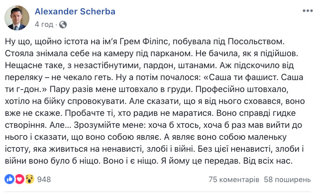 "Тільки що істота на ім'я Грем Філліпс побувало під Посольством. Стояло, знімало собі на камеру під парканом. Чи не бачило, як я підійшов. Нещасна таке, з незастебнутими, пардон, штанами", - розповів про появу пропагандиста дипломат.