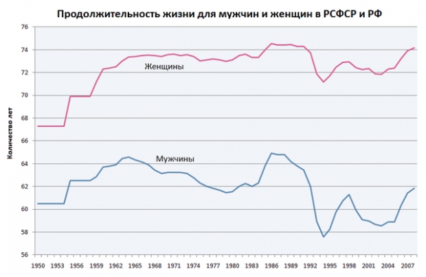 Що ми бачимо? Ця велика геополітична катастрофа, від якої ми до сих пір ще не змогли до ладу відійти, і яка трохи не привела нас в демографічний штопор, знизила наше ОПЖ на ті ж 5-6 років. Чи треба говорити, що смертність в 90-і роки пройшла як косою по росіянам?