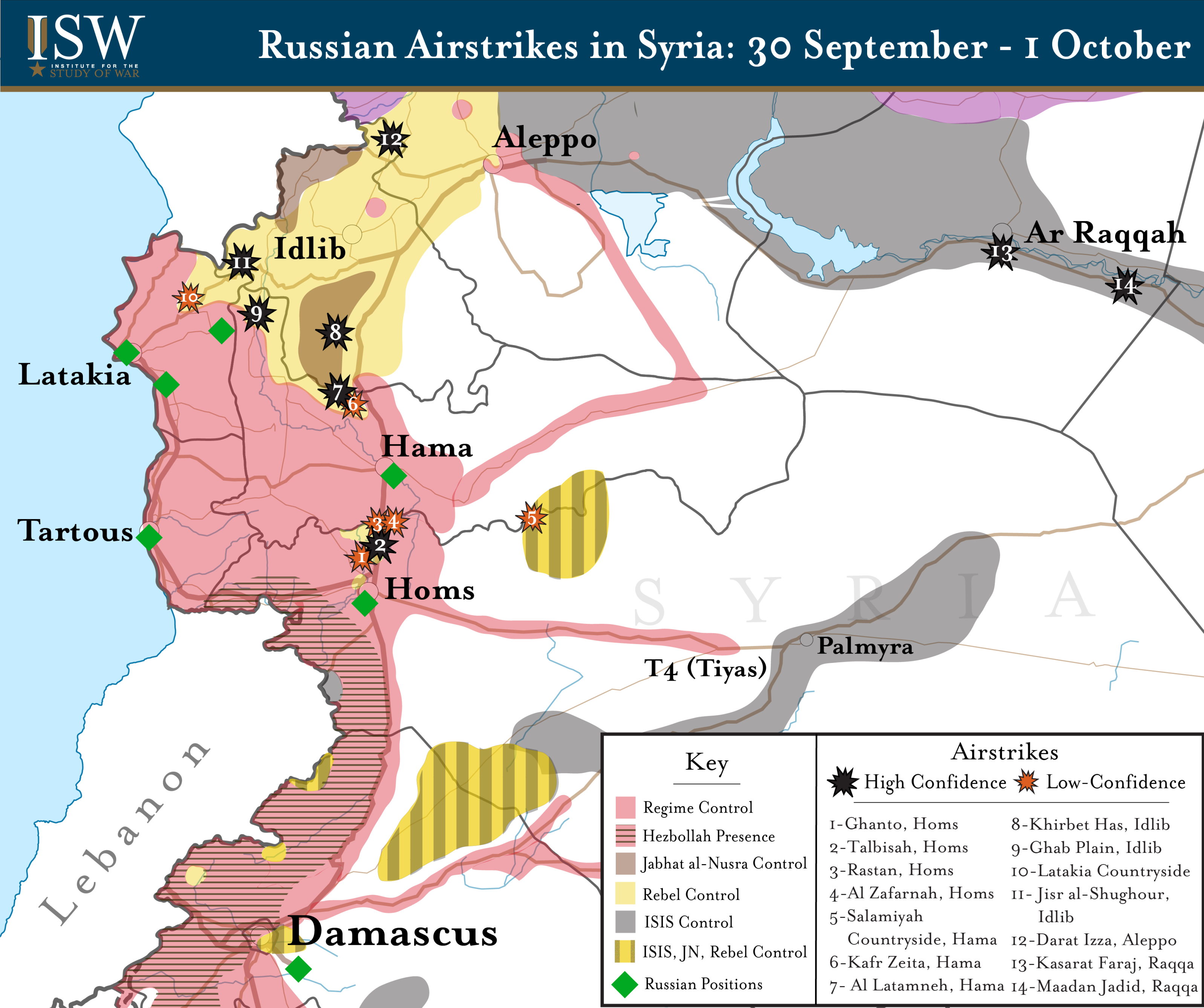 Якщо вважати зазначені вище дані достовірними, то виявиться, що російські військово-повітряні сили б'ють по розташуванню, головним чином, опозиційних сил в межах контрольованої силами Асада території, а також цілі вздовж лінії розмежування між військами сирійського уряду і різними опозиційними формуванням. Причиною відмінностей на картах стає нерозуміння, хто саме контролює і хто де знаходиться, тому що ці райони є предметом гарячих суперечок. Російські операції, здається, є частиною спільної операції, спрямованої на допомогу Асаду в поверненні території (під свій контроль-ред.). Якщо наземні війська сирійського диктатора рішуче просунуться в областях, де російські літаки скинули бомби, то мета кампанії стане цілком очевидною.