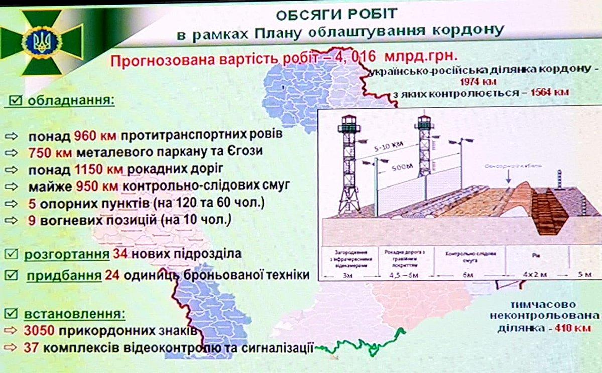 У 2015 році урядом Арсенія Яценюка був затверджений план інженерно-технічного облаштування державного кордону, згідно з яким створювалася система охорони державного кордону. У систему входять інженерні споруди уздовж державного кордону, облаштування опорних пунктів, розгортання нових підрозділів, придбання нової техніки, розгортання комплексів відеоконтролю і сигналізації.