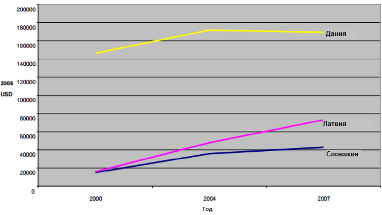 Графік 2. Розрахунок витрат на 1-го солдата в Латвії, Словаччини та Данії (фіксовані ціни, 2005 доларів США)