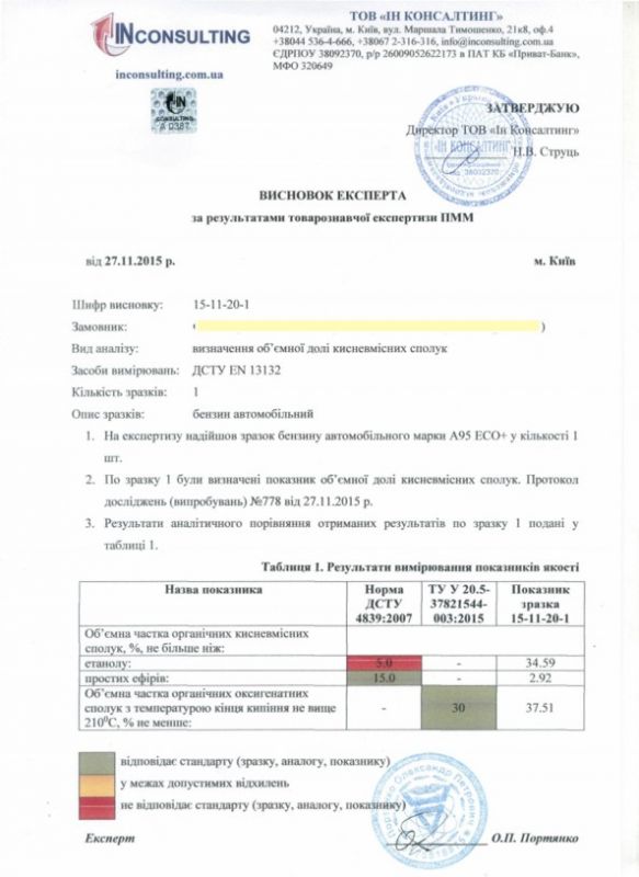 До редакції звернувся житель міста Києва, який купився на привабливу рекламу нового дешевого екологічного палива 95 eco +. Розраховуючи серйозно заощадити на новому бензині, водій заправив свою машину новим бензином на заправці WOG, але вже до кінця тижня двигун автомобіля почав глухнути. І чим далі, тим частіше. В кінцевому підсумку машину просто не можливо було завести. Водій зробив експертизу палива в лабораторії, яким заправляв авто останній місяць. Експертиза показала, що об'ємна частина етанолу склала 34,59%, хоча норма ДСТУ 4839: 2007 - 5,0%.