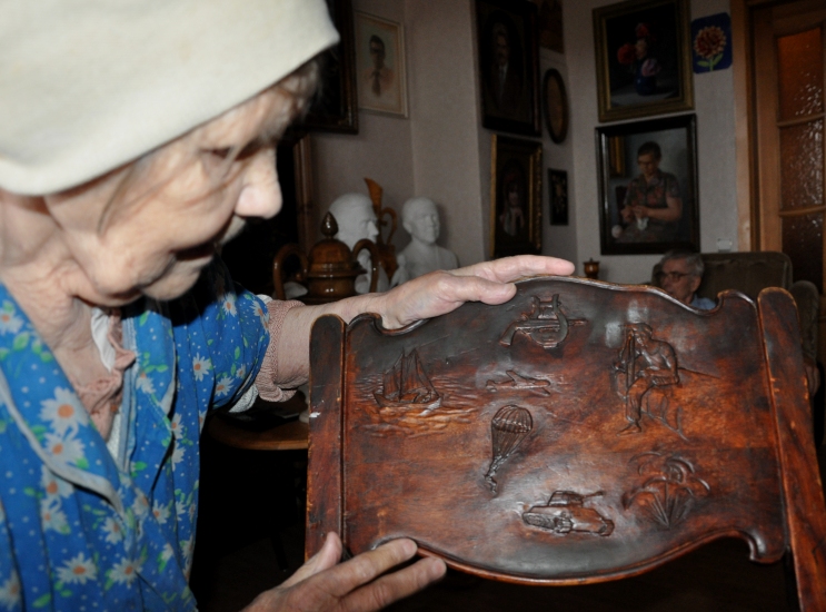 «Ми народилися і виросли на березі о.Ільмень у риболовецькій селі Взвад (Новгородська область Росії -« ОстроВ »), - розповідає Парасковія Миколаївна, пояснюючи сенс різьблених сюжетів на спинці сімейної реліквії. - З 12 років Льоня з батьком рибалив нарівні з дорослими. В армії був десантником. Коли почалася війна, його перевели в стрілецьку дивізію. У 42-му в битві під Сталінградом його поранило в ліву ногу. Врятувати її завадила евакуація: уражену гангреною ногу наспіх загіпсували, а потім було вже пізно ... Так ось, в 21 рік, Ленюшка залишився без ноги », - зітхає жінка.