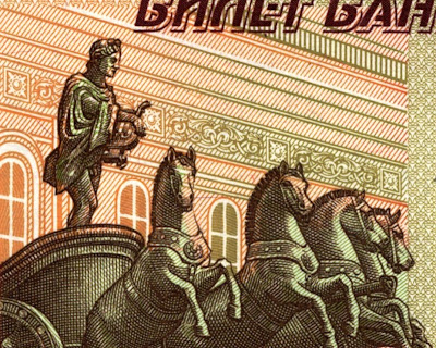 Квадрига Аполлона на фронтоні Великого театру в Москві (майстерня І.П. Віталі, 1853 р Мідь, діфовка)