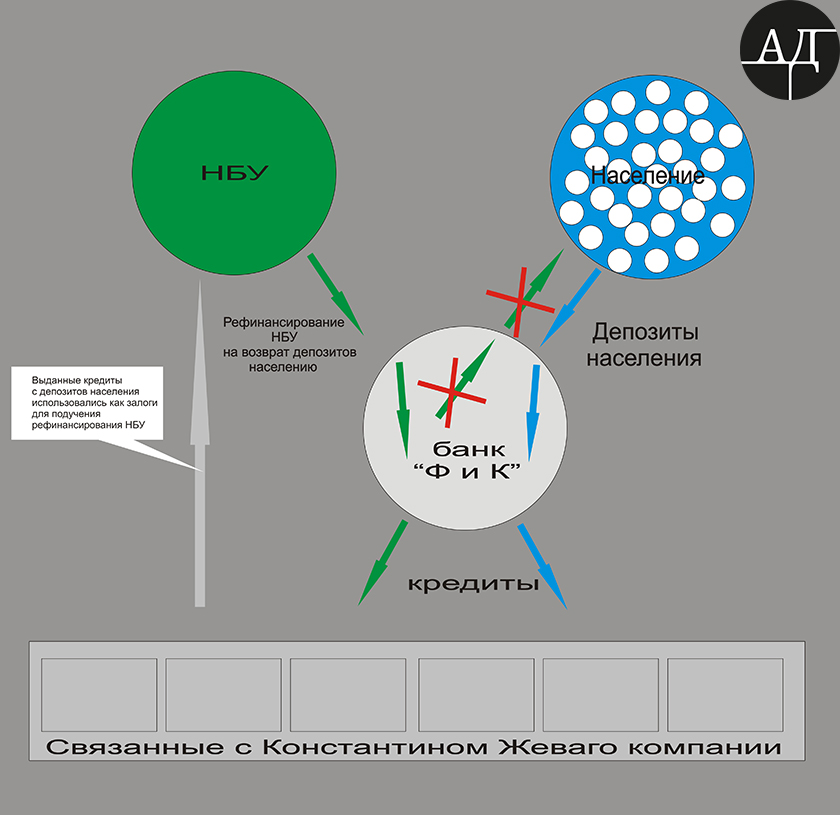 До моменту оголошення банкрутства банку «Фінанси та Кредит» все жеваговскіе структури свої кредити в банку хоч і не повертали, зате обслуговували, що і давало можливість використовувати сам кредитний портфель - як запорука для рефінансування НБУ.
